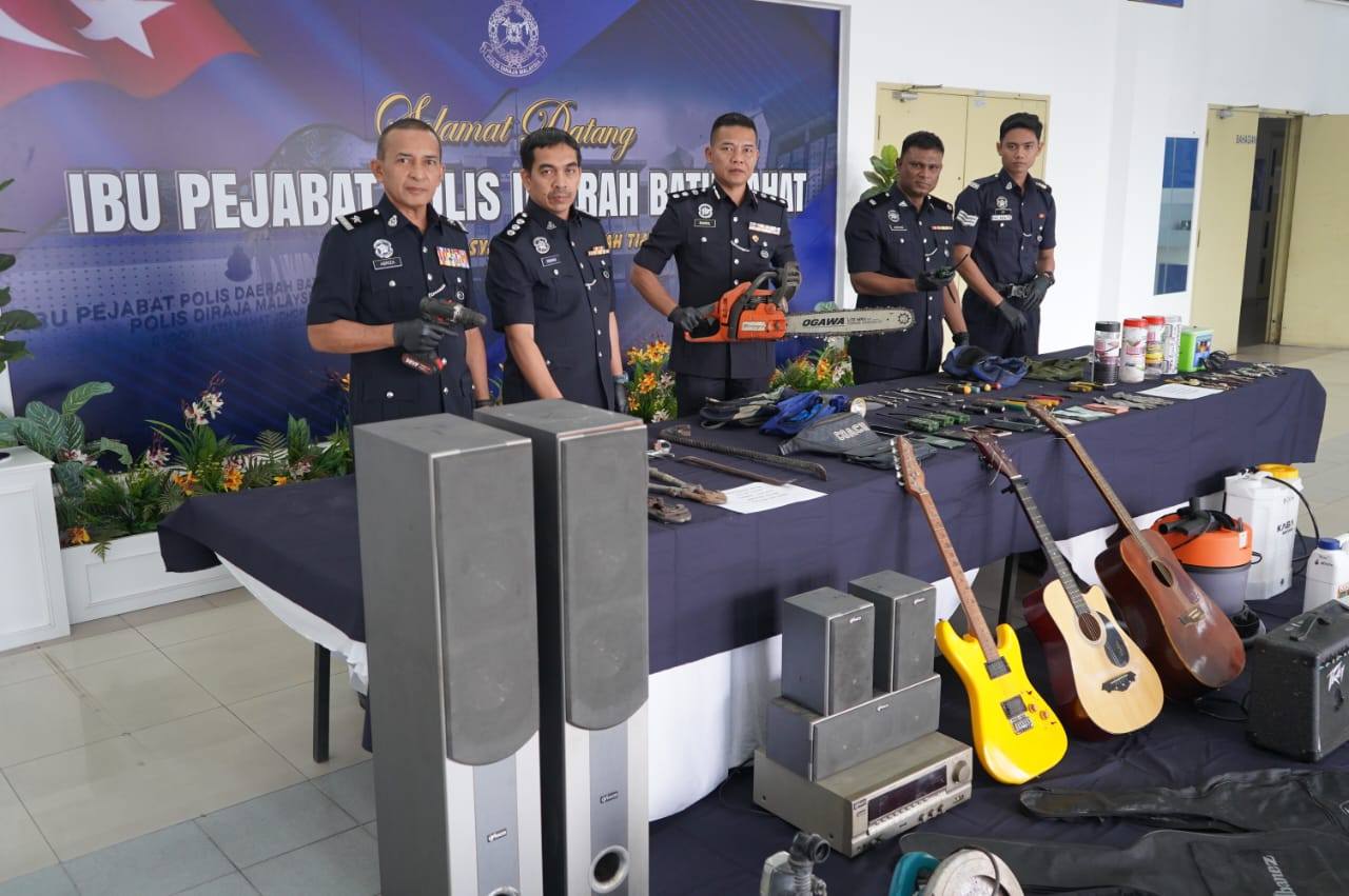 (峇株巴辖11日讯)警方逮捕4名男子,侦破在新加兰、龙引和峇株巴辖一带破门行窃党,起获大批贼赃,除了贵重物品,还有三把吉他。