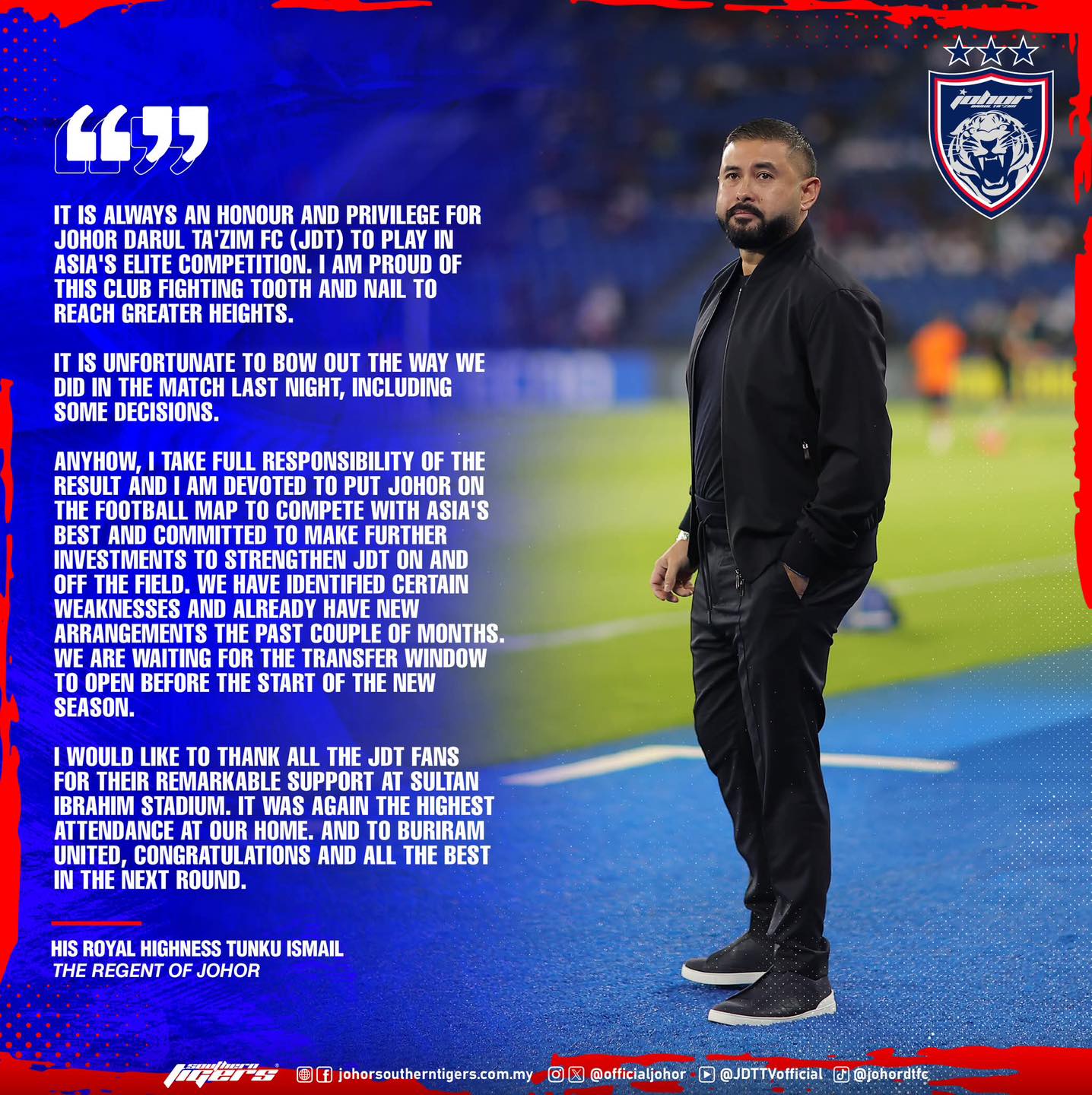 “我致力于让柔佛足球队登上足球版图,与亚洲最优秀的球队竞争,并承诺进一步投资以加强 JDT 场内场外的实力。”