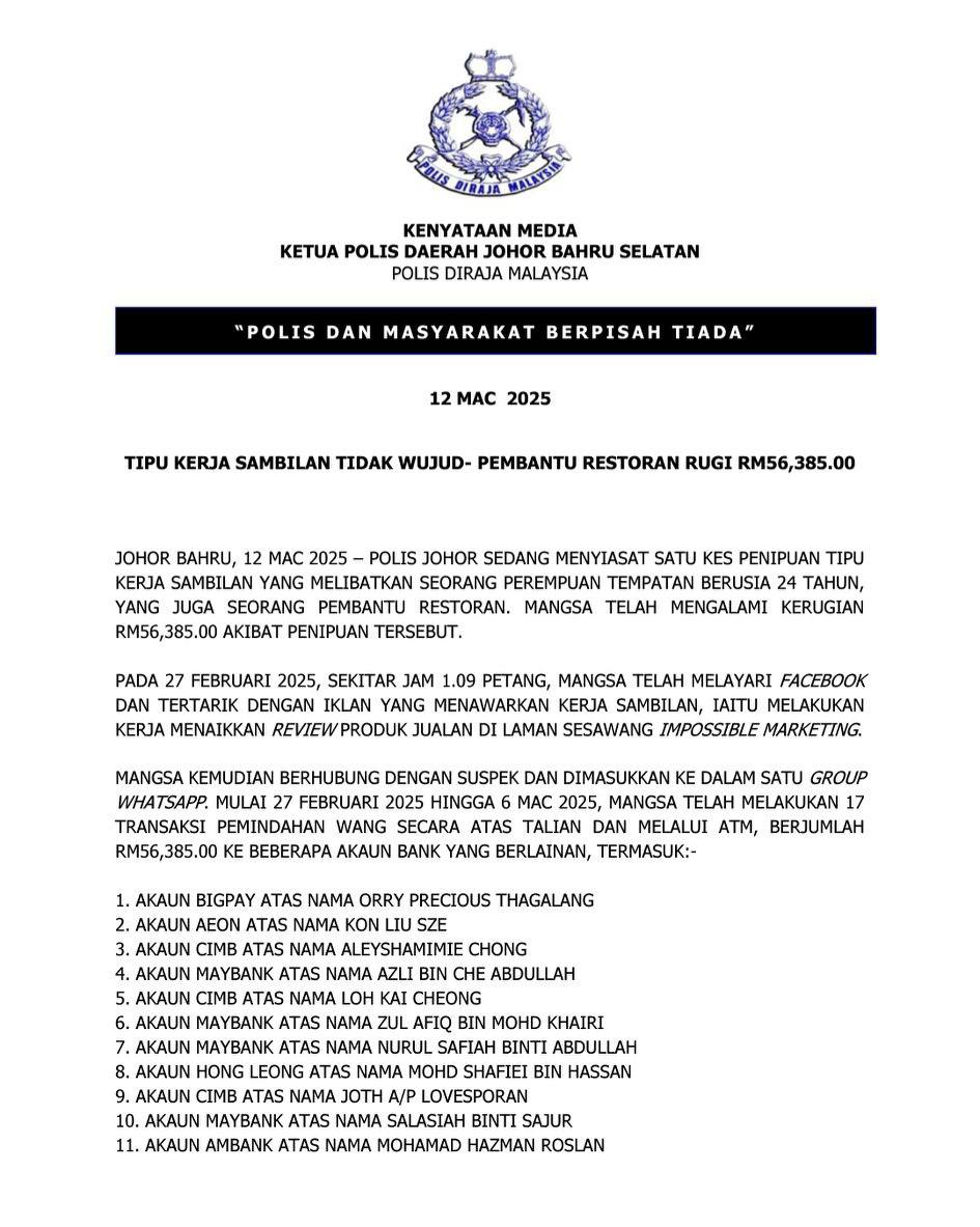 (新山12日讯)24岁女子坠兼职陷阱,被骗走逾56万令吉,警方将所汇款的银行户头,全数列下,让钱骡户头无所遁形。