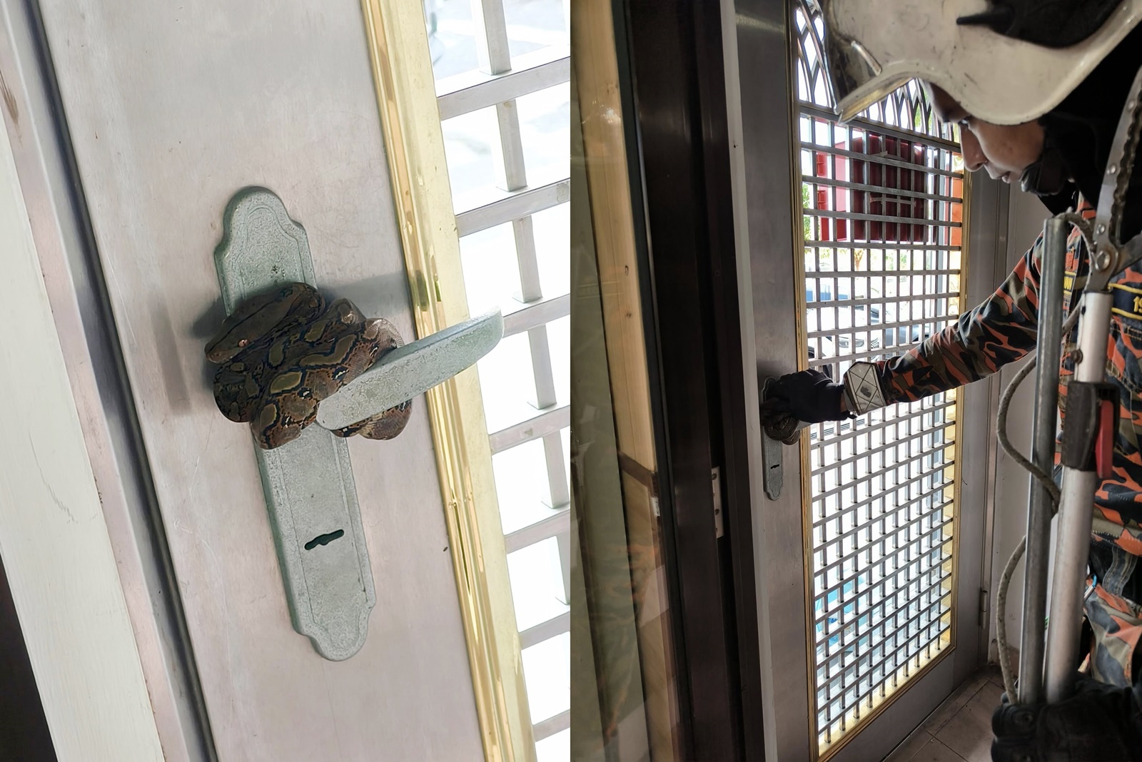 (新山18日讯)最雷人的“门把挂件”!马华巴西古当区会会所铁门处,一早惊见一条蟒蛇卷在门把处,急召消拯员捉蛇。