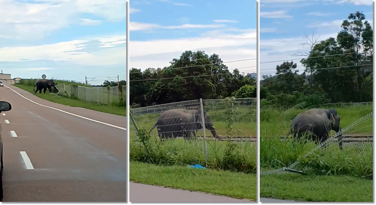 一名男子Ah Siong今早从令金下居銮途中,目睹有一只野象过马路,并至对面的火车铁轨处,更指马路还留下很多野象粪便。