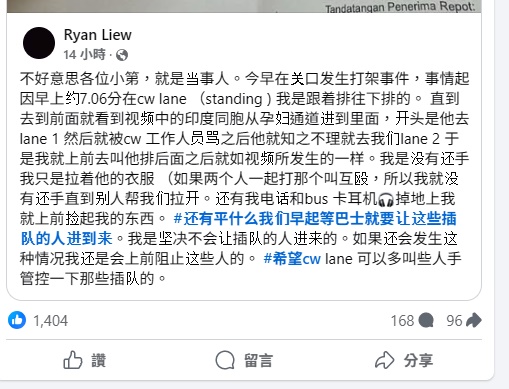 自称是事主之一的男子Ryan Liew,事后在面子书发文声称,事情起因今早上约7时分,在巴士候车处,他跟着队伍排队,唯一名印裔男子从孕妇通道插队。