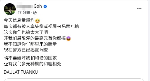 由于中国国家主席习近平官访马来西亚,昨日有“Cayson Goh”网民,在“JB柔佛吹水站”分享国家元首陪同习近平签名的新闻报导,撰述不堪入目的文字,不仅侮辱陛下,还侮辱马来人。