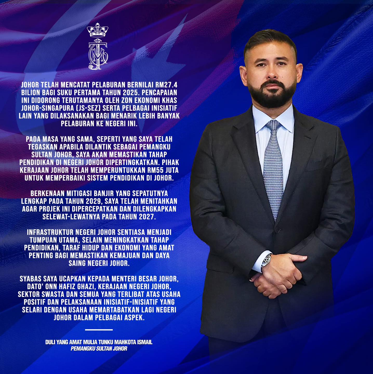 柔佛摄政王发文强调,基础设施建设,一直是柔佛关注的重点,此外还致力于提高教育水平、生活水平和经济水平,这对于确保柔佛具备竞争力,取得进步非常重要。