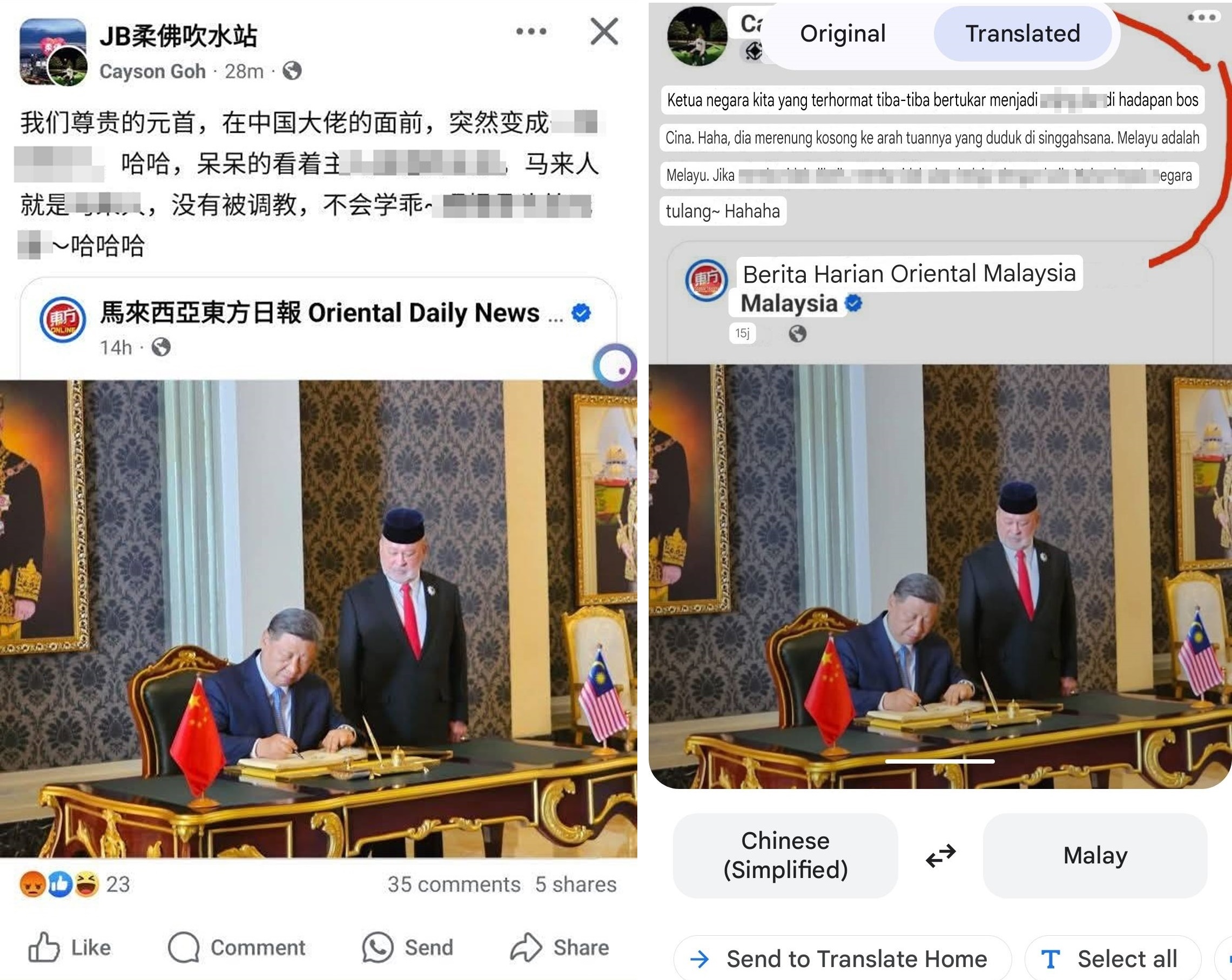 有关侮辱陛下的贴文,指陪同中国国家主席习近平签名时,以“野狗”、“喂根骨头”、“呆呆看着主人坐他的王位”等侮辱字眼,更指马来人没有被调教。