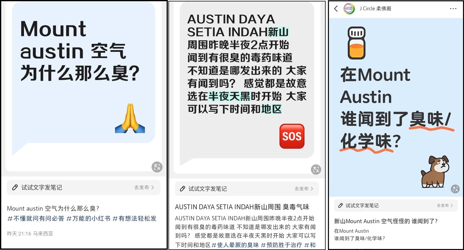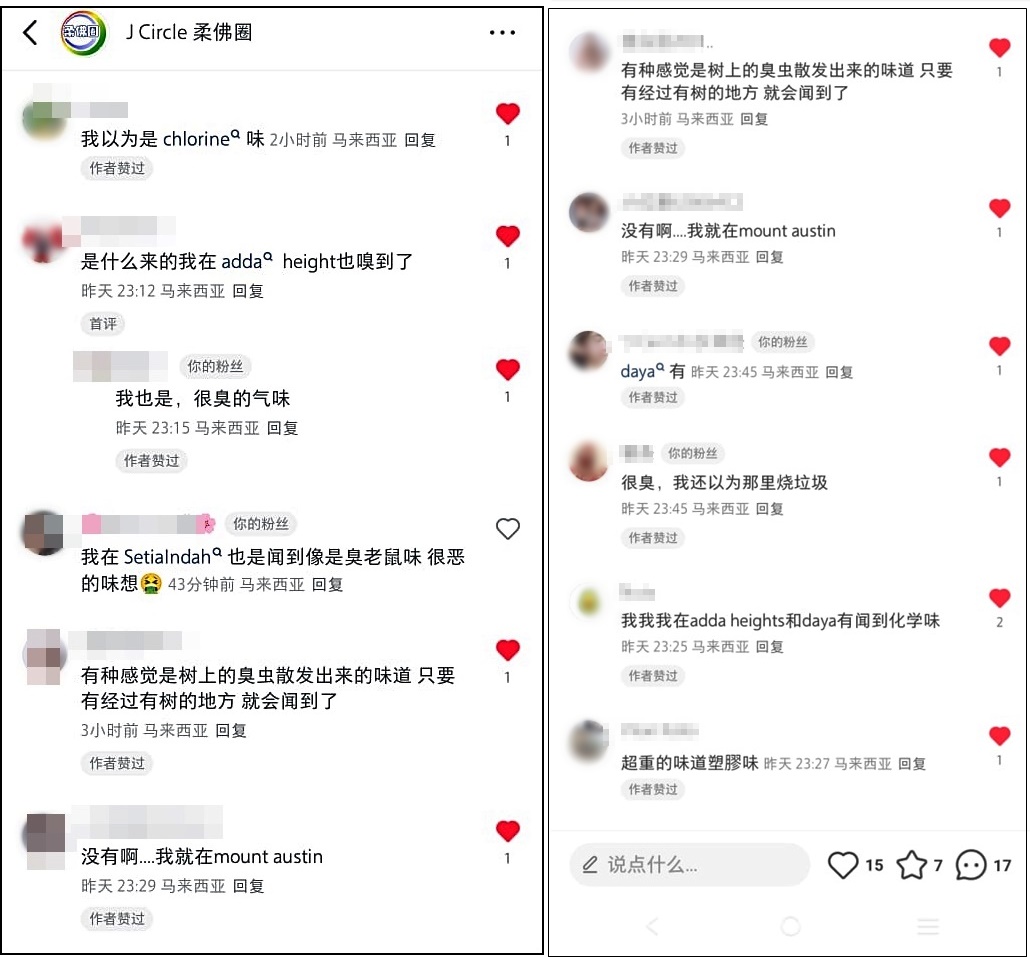 不少民众也在社交平台讨异味源头,却发现闻到异味的地区相当广,包括和丽园(Austin Heights)、御景园(Seri Austin)、艺达园(Adda Heights)、茂奥斯汀、福林园、班兰、拿督翁、Setia Indah、柔佛再也、宏艺花园、烈光镇、乌鲁地南等。