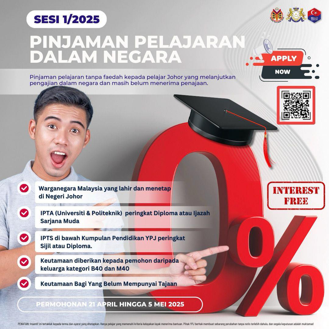 柔佛教育基金会(YPJ)公布,2025年第一期免息教育贷款,从4月21日起至5月5日,开放让柔佛就读于高等学府的学生申请。