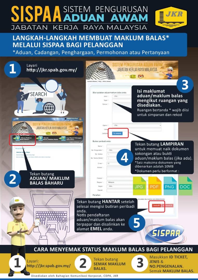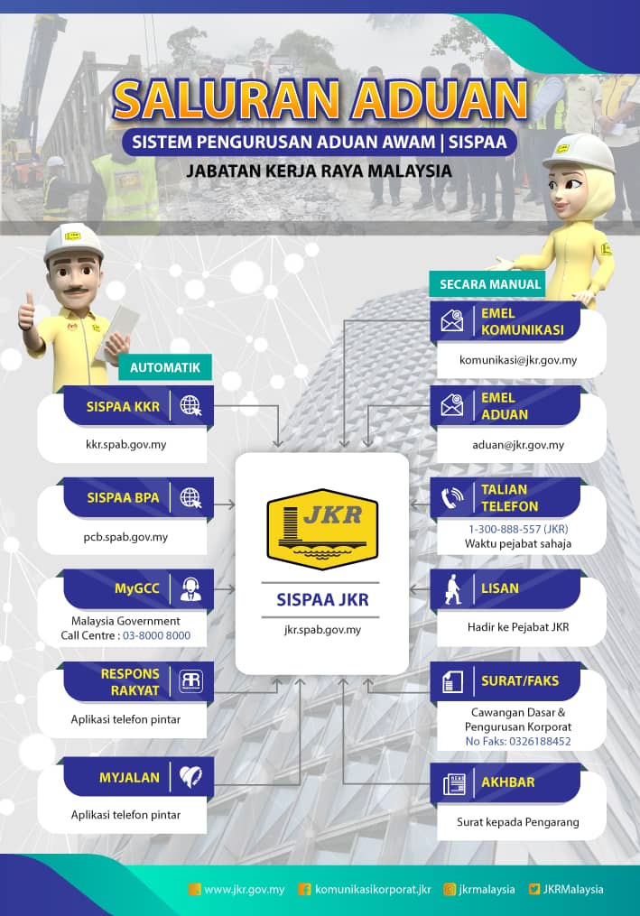 有关公共工程局(JKR)的投诉途径,可通 SISPAA JKR 反映,点击页面后,选择“Aduan/Maklum Balas Baharu”。