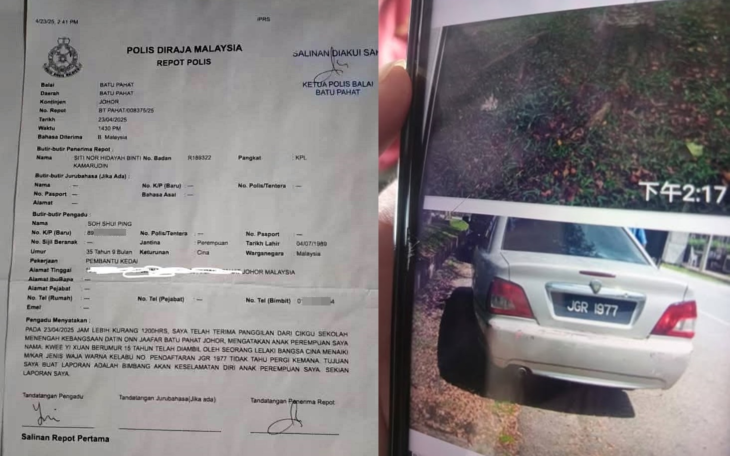 马来西亚社警关怀组织分享贴文,一名母亲(35岁)投报,指4月23日大约中午12时,接到峇株巴辖Datin Onn Jaafar国中老师来电,告知15岁的女儿Kwee Yi Xuan被一名华裔男子接走。