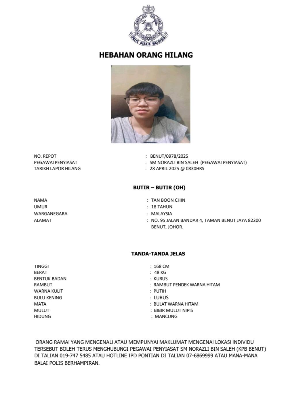(笨珍29日讯)18岁华裔青年晨跑后,突然失联,家人忧其安危,报警寻人。