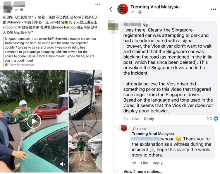 另一方面,有目击者声称,当时新加坡轿车已经打了方向灯,准备等候停车,但是大马轿车司机不愿等待,便指责新加坡车挡住了路。