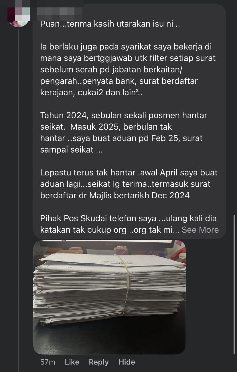 也有外州网民留言:“YB…这邮政局问题不只在柔佛,森美兰也一样,邮差已经个月没来了,很多邻居和居民都在抱怨。”