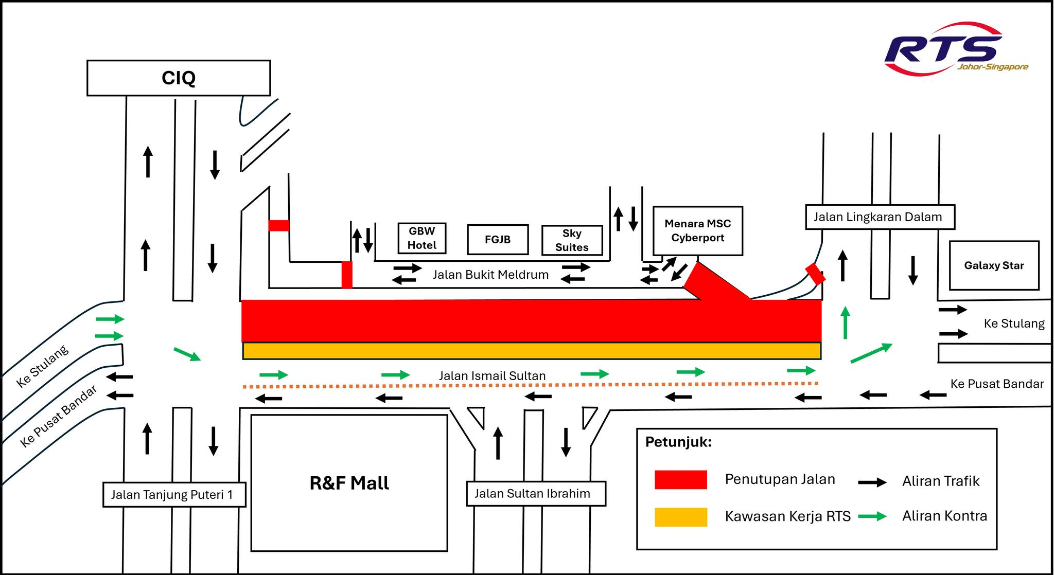 根据新柔捷运营运私人有限公司(RTSO)通告,5月13日至30日,晚上10时至凌晨5时,苏丹依斯迈路(朝士都兰方向)封闭,也就是位于富力广场(R&F)前路段。