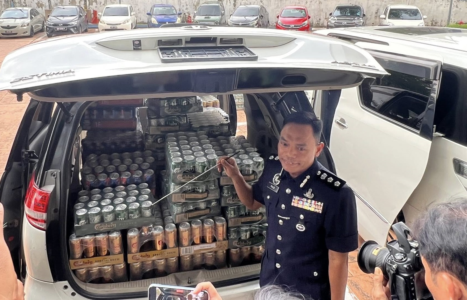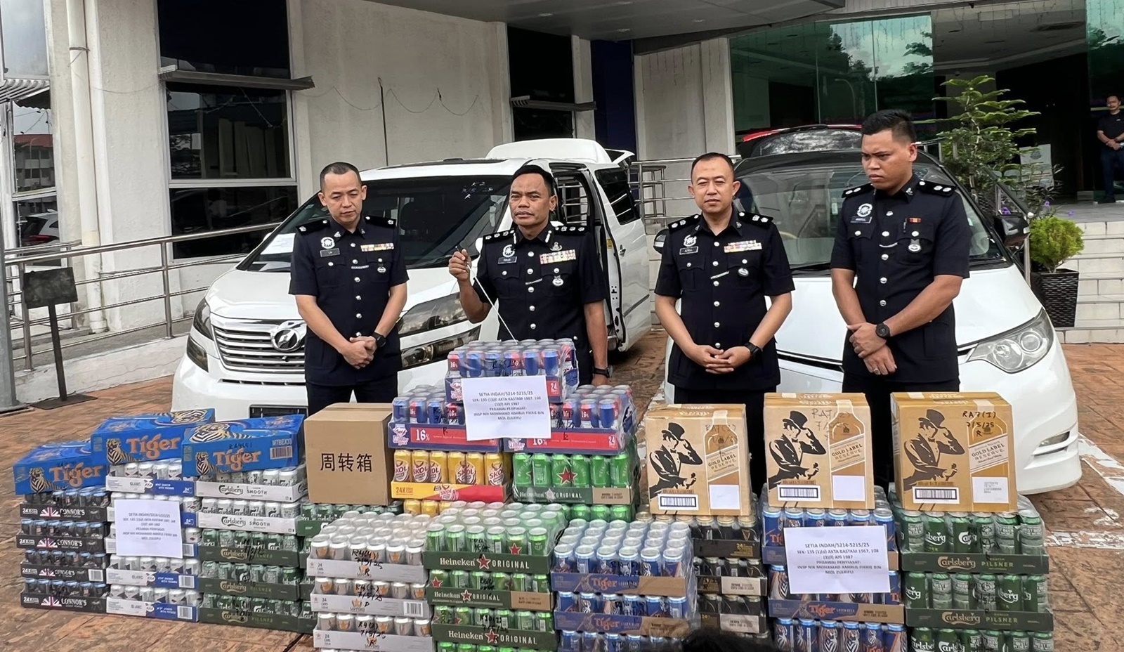 他指出,行动中,警方起获220箱酒类,大约有27个品牌,包括在一辆丰田Estima和一辆丰田Vellfire轿车内, 也发现了酒类。
