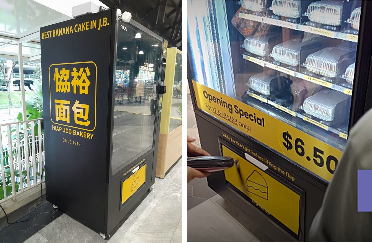 可是从5月17日开始,新加坡武吉班让的Senja小贩中心内,出现“协裕”贩卖机,新加坡人不用越堤,也能买到窑烤香蕉蛋糕。