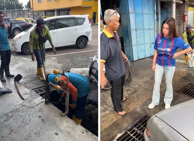 当她昨日走访Ronggeng商店区,寻找问题根源,发现有些店家把排水沟用水泥彻底封死,没有水沟盖,也就下不去做清理工作。