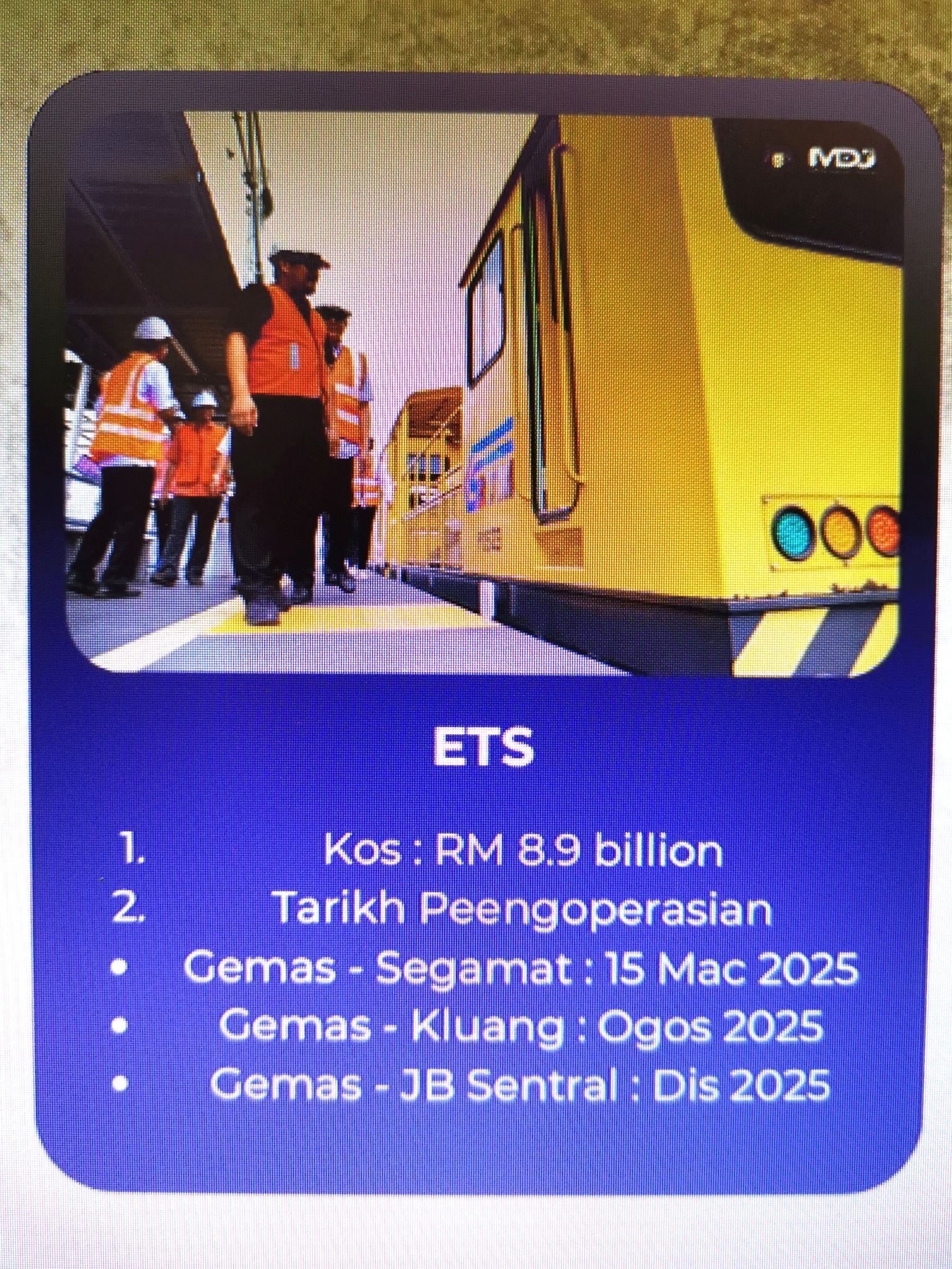大臣还说,随着每一站的双轨电动火车陆续通车,估计新山中环综合车站于9月运作。