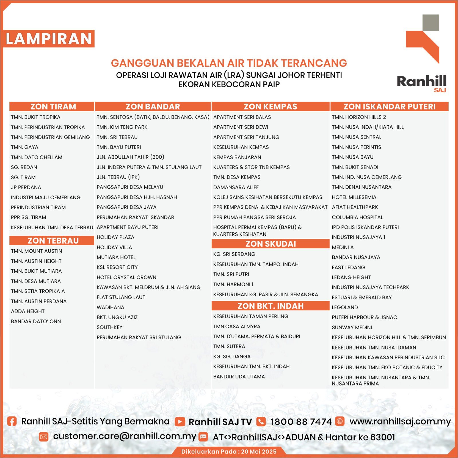 掌管柔佛基础建设的行政议员莫哈末法兹里今晚9时许发文,指此次事故导因是抽取士姑来河的水管破裂,造成泵房淹水。