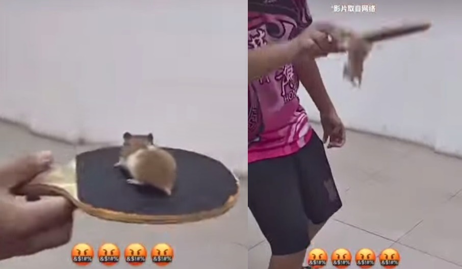 据悉,一名青年身穿龙狮体育会制服,拍视频分享待仓鼠过程。除了把仓鼠当乒乓来玩,放在乒乓拍上“抛仓鼠”,造成仓鼠高处掉在地上。