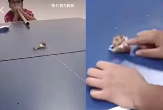 青年还将仓鼠放入塑料管中,再用力吹气,把仓鼠当子吹箭般往外射出。