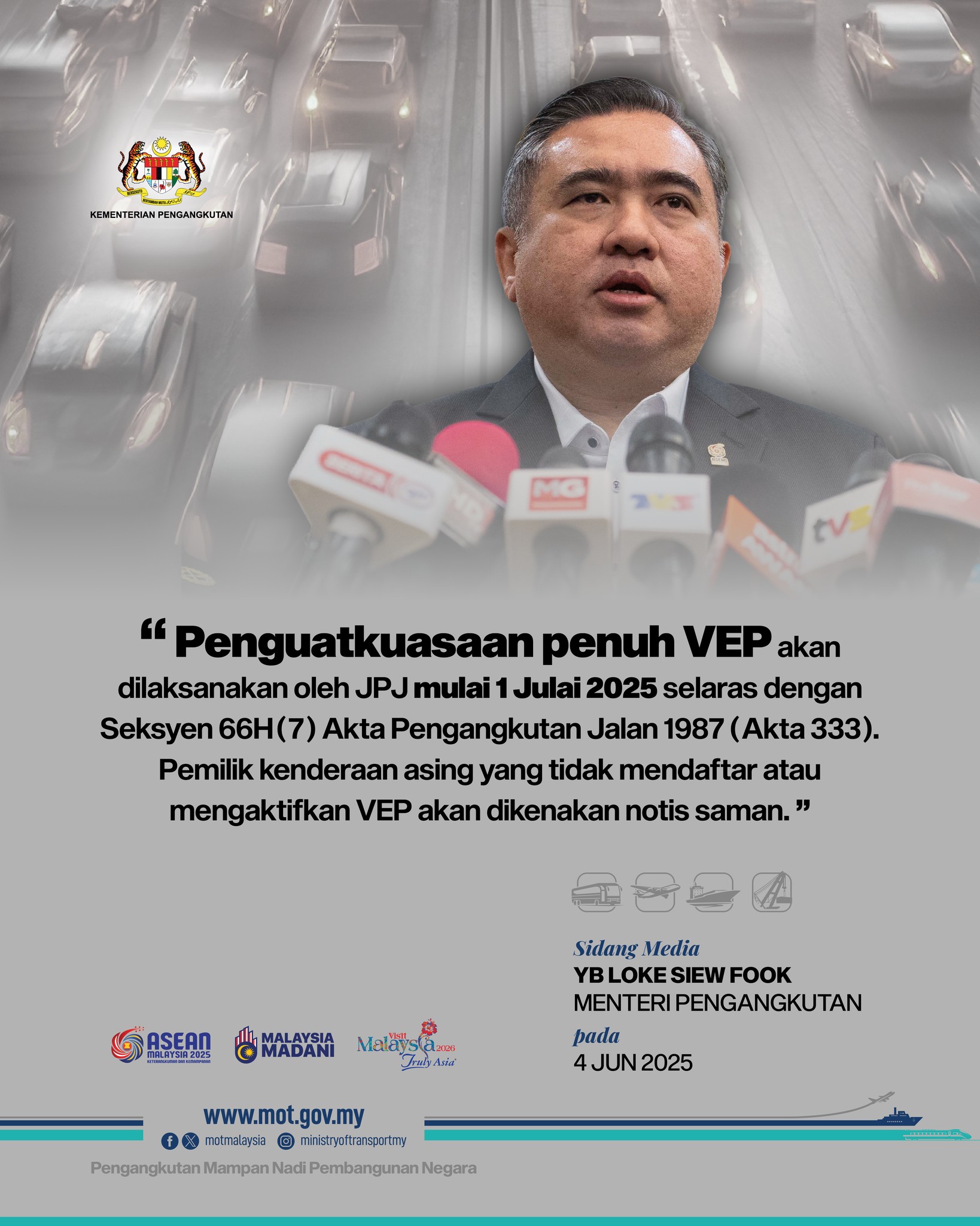 《马新社》报导,交通部长陆兆福于今日在新闻发布会上指出,届时,陆路交通局将向未注册或未激活VEP的外国车辆车主,发出传票。