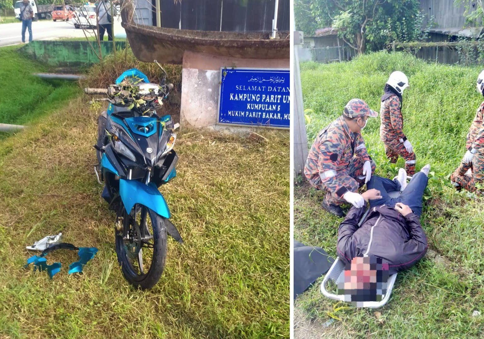 他说,初步调查,当时骑士从麻坡市区朝巴冬方向行驶,因失控撞向左侧路肩的石堤和灯柱,骑士被抛出并撞到了路牌,再坠入沟里。