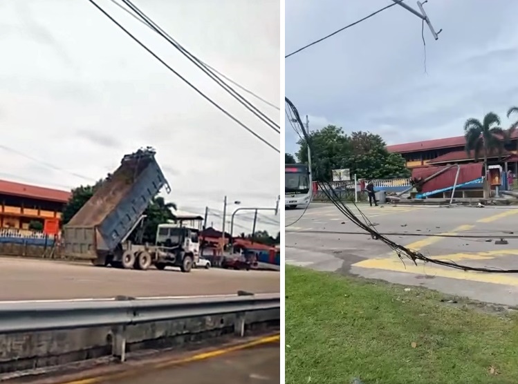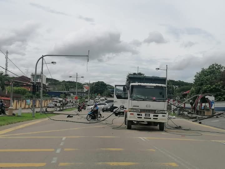 (新山10日讯)罗厘司机卸下泥土后,忘了“收车斗”,以致车斗在行驶途中勾到电缆,造成3支灯柱也扯倒,庆幸的是没有造成人命伤亡。