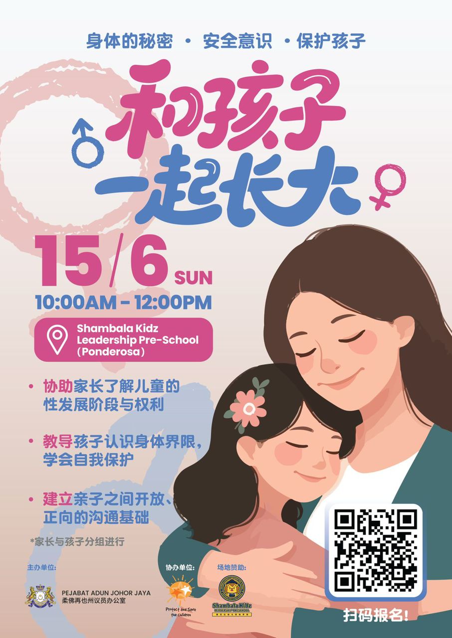 为提升亲子间对性教育的认知,柔佛再也州议员办公室于6月15日(星期日)举办“和孩子一起长大”亲子性教育工作坊,邀请民众一起守护孩子的身心健康。