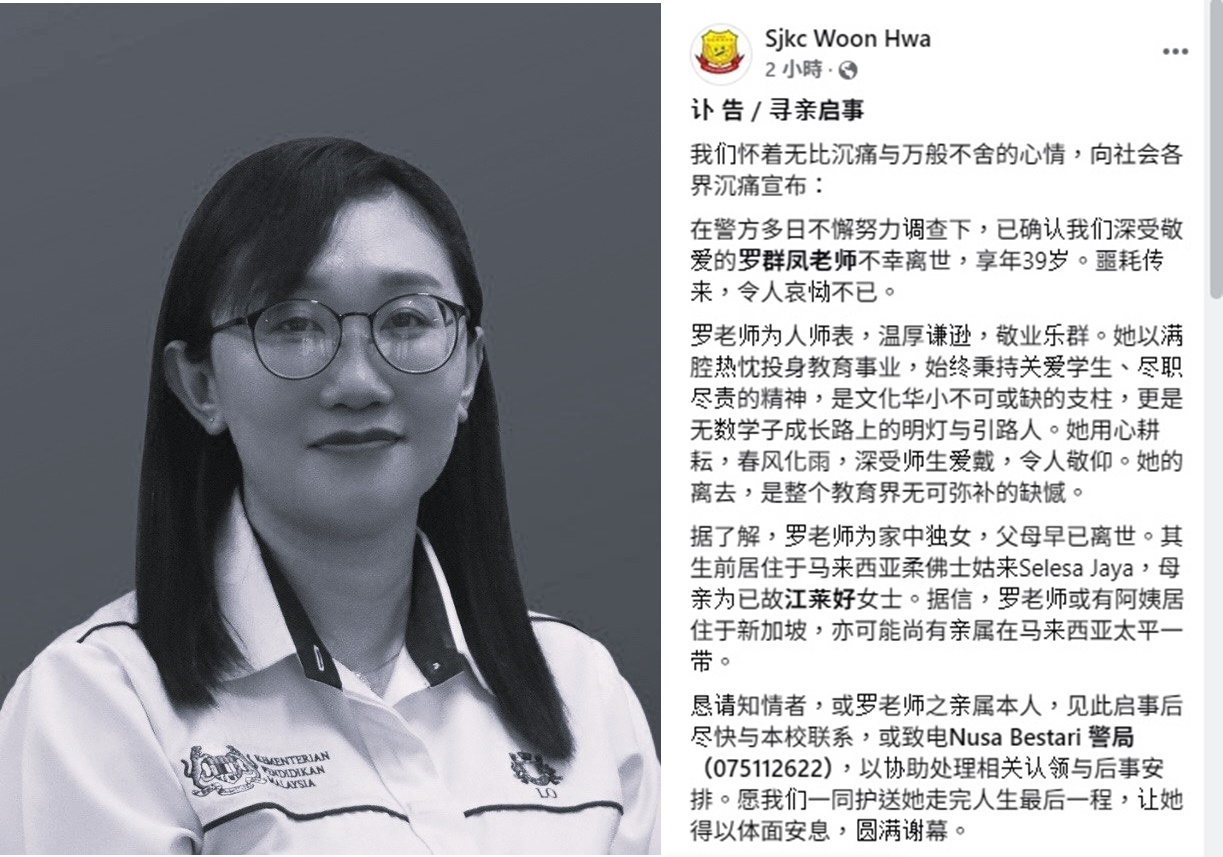 根据新加坡《联合早报》报导,39岁罗群凤副校长缺勤多月后, 被发现死于柔佛士姑来的住家内,尸体已严重腐烂。