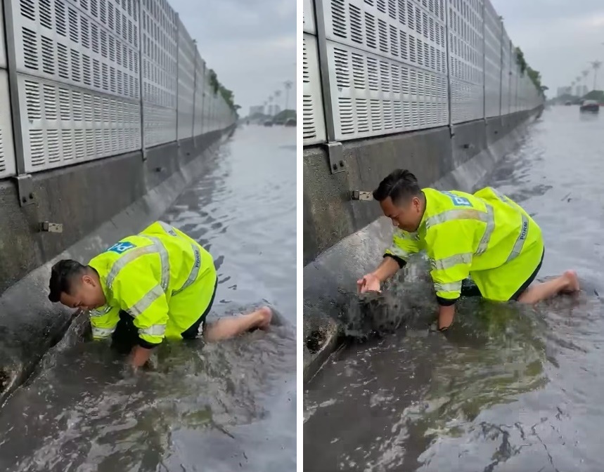 (新山18日讯)大雨一来,路面积水,交警为了疏导交通,跪在路边徒手清理沟里淤泥和垃圾,其尽责行为虽让人尊重,但也纷纷不解:“这是警察的工作?”