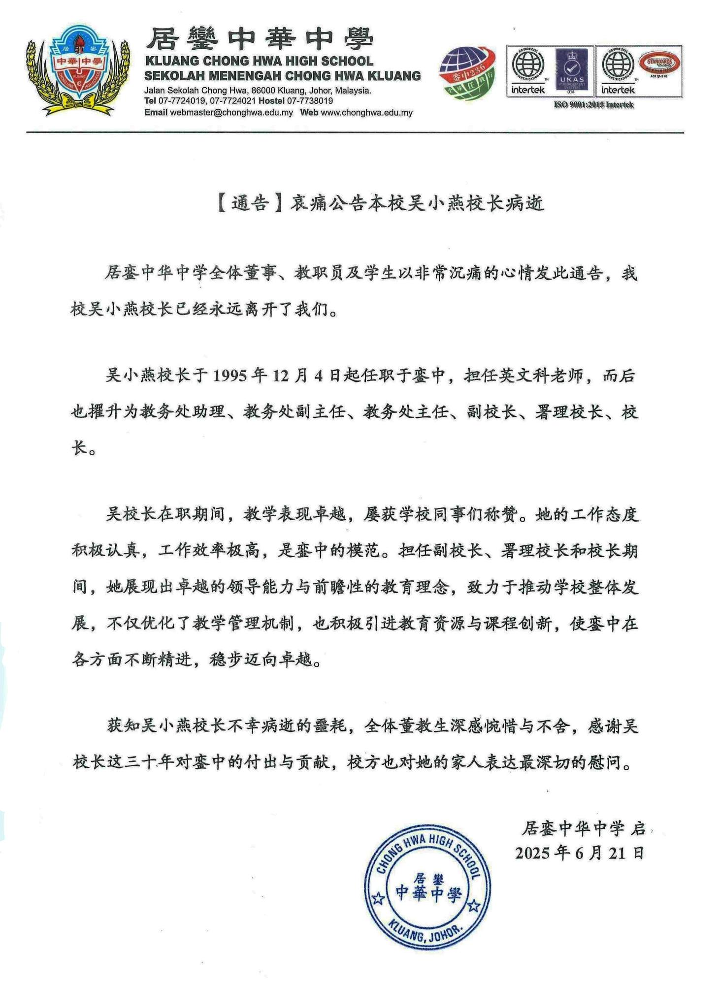 居銮中华中学全体董事、教职员及学生今日发此通告,证实吴小燕校长离世消息。