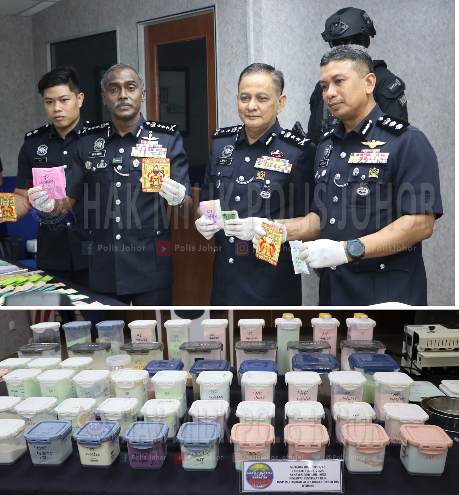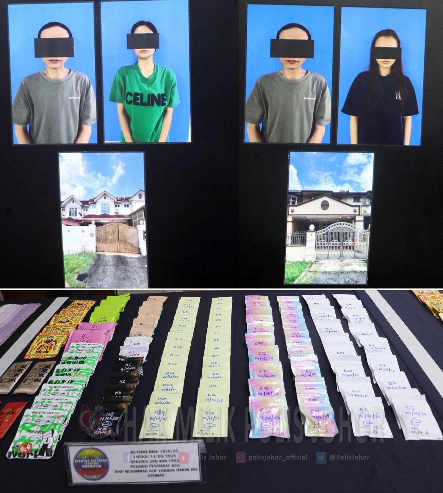 柔佛总警长拿督N古马昨日召开新闻发布会,宣布警方于6月14日晚上7时30分,直到6月15日凌晨5时的行动,取缔位于丽宁镇的两间住宅单位,捣毁一个贩毒集团。