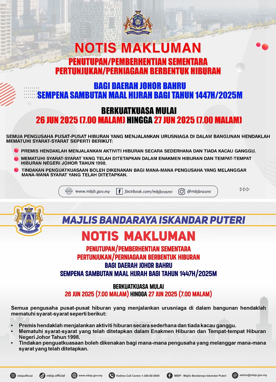 新山市政局(MBJB)、依斯干达公主城市政局(MBIP)发出通告,辖区内的娱乐表演和活动,于6月26日晚上7时,至6月27日晚上7时,暂停一日运作。
