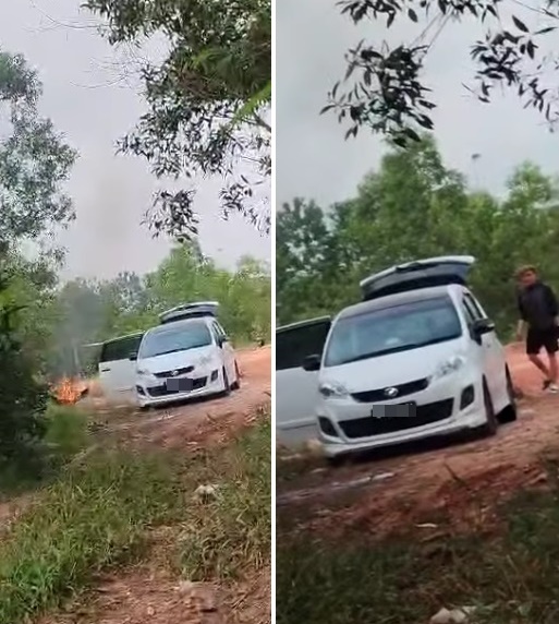 另一视频,有个男子驾驶白色轿车,旁边燃起火堆,相信是罪魁祸首。