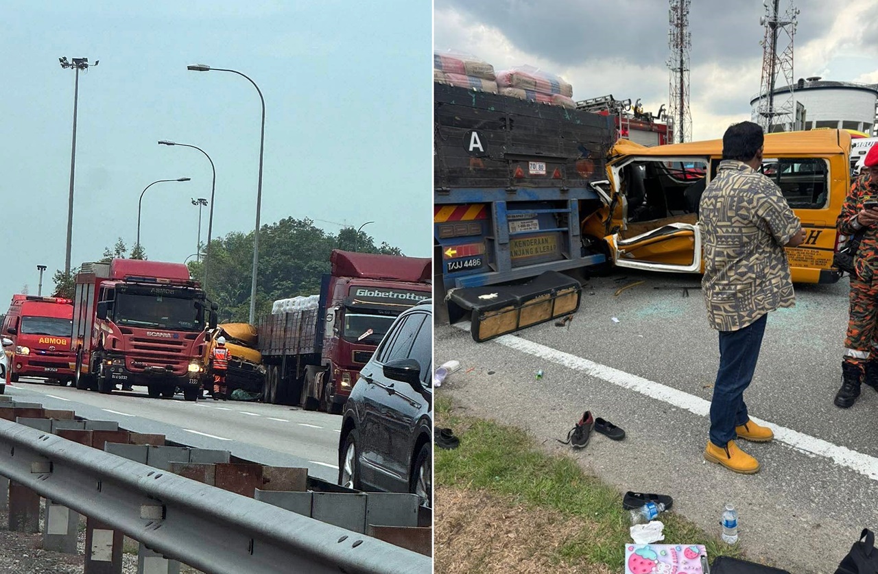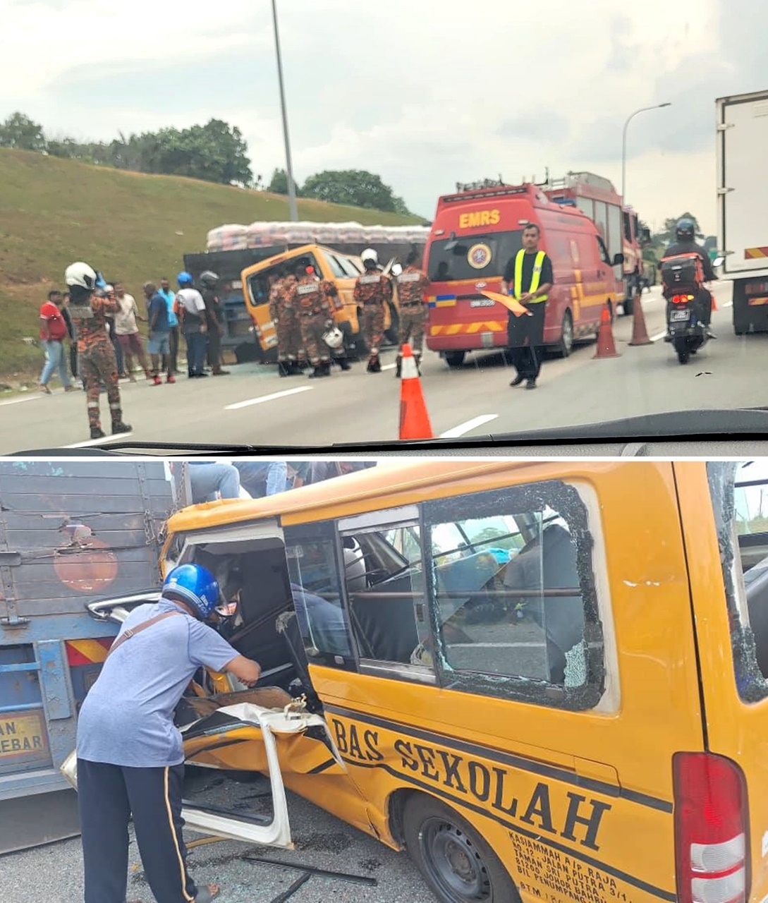 消拯局指挥官 Muhamad Aziz指出,消拯队赶到现场时,发现车祸涉及一辆校车和一辆停在路肩上载有水泥的拖格罗厘。
