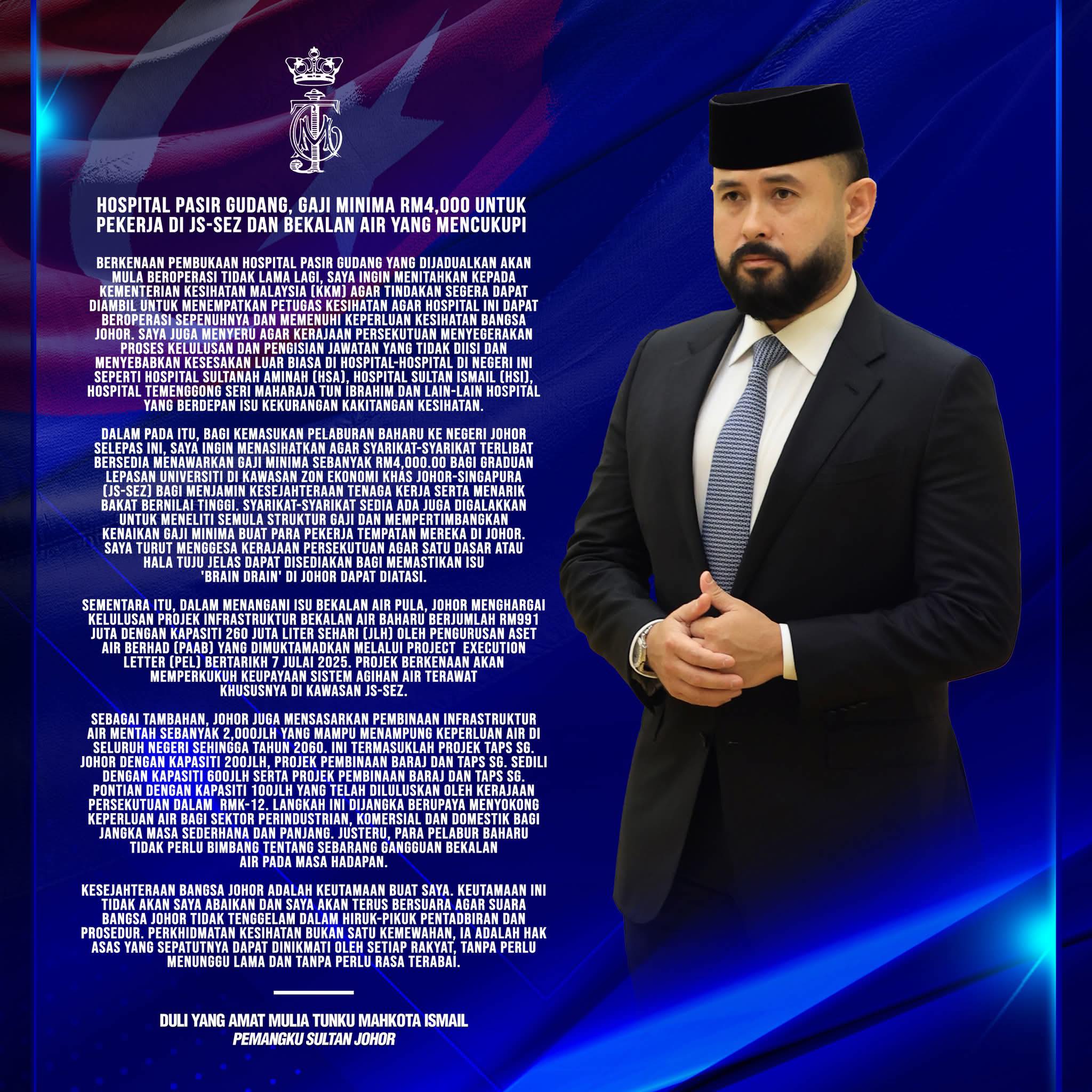 柔佛摄政王今日发文发表观点,认为此举可保障劳动力的福祉,并吸引高素质人才。