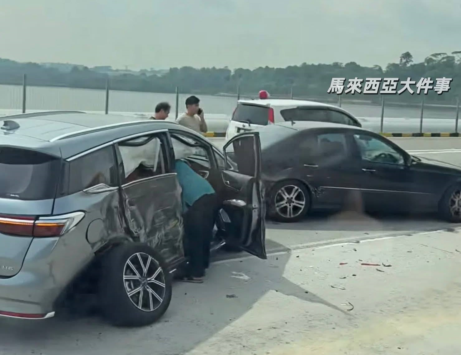 (新山17日讯)新加坡轿车疑突然切换到巴士车道,造成巴士司机闪避不及撞上,以致柔佛长堤上演4车连环撞。