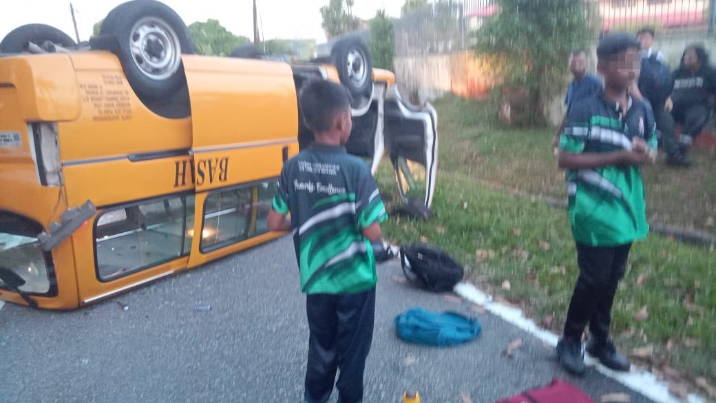 (新山18日讯)校车撞沙井洞翻覆,相信是窃贼撬开井盖酿祸,让学生险些送命。