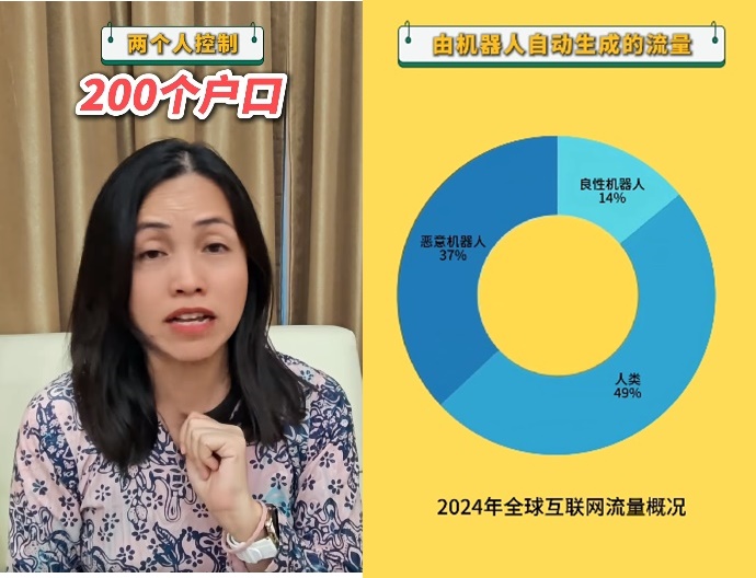 她说,根据《2025恶意机器人报告》显示,去年全球网络流量中,有51%都是机器人生成的,首次超过真人生成的流量。