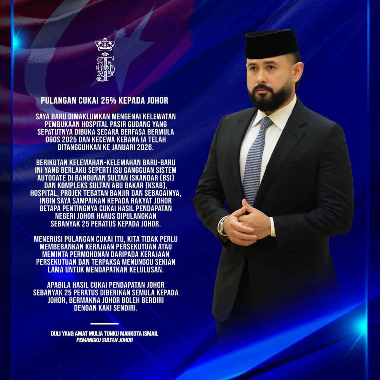 对此,殿下想向柔佛子民传达信息:“将柔佛上缴税收的25%退还回来,是多么重要。”