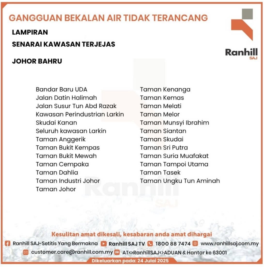 📍受影响地区有:乌达新镇、Datin Halimah路、敦阿都拉萨路支路、拉庆工业区、胡姬花园、美雅山庄 、金葩花园、柔佛花园、翁姑幕欣、士姑来花园、 茉莉花园、Kenanga花园、Kemas花园、Melati花园、南滨园 t、淡杯第一花园、皇后花园等(详情见图表)