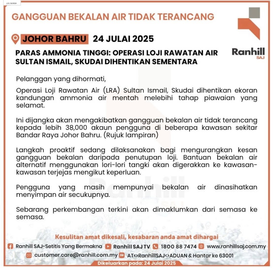 柔佛水务联熹私人有限公司(Ranhill SAJ)指出,位于士姑来的苏丹依斯迈滤水站(LRA), 因生水中氨(ammonia)含量超标而被迫暂停运营。