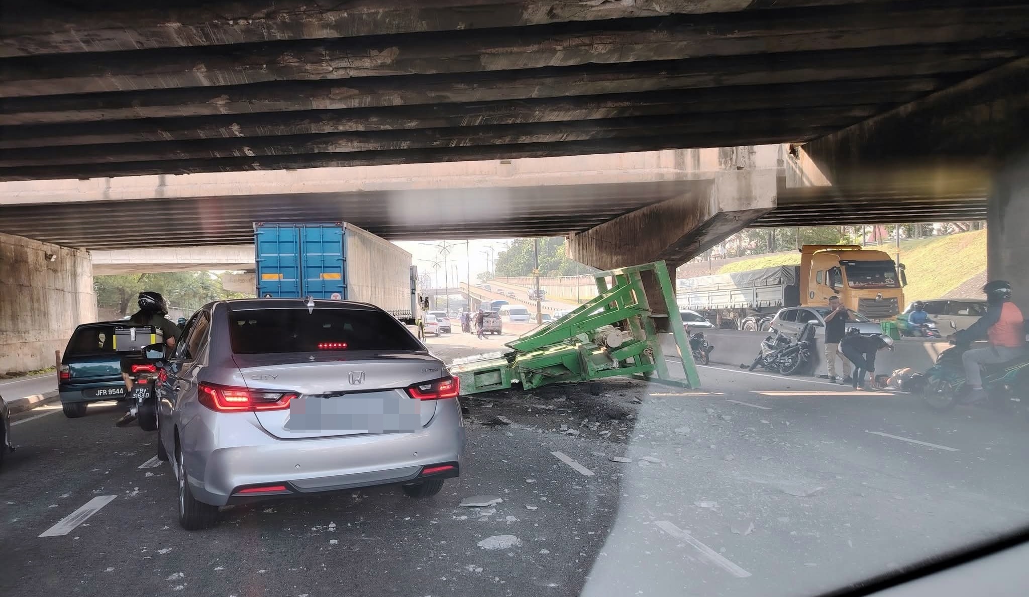 他说,初步调查,事发时,39岁司机驾驶Man TGA33拖格罗厘欲前往吉隆坡,驶经柏伶汽车高架天桥底时,承载物撞及天桥混凝土墙顶部。