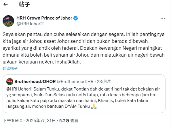 “BrotherhoodJHR”指笨珍面对4天制水,即星期一和星期二(7月28日和29日)是例常维修,星期三(7月30日)又指是水管问题突发制水,直到星期四(7月31日)都未见恢复水供,因此标签摄政王,要求殿下关注。