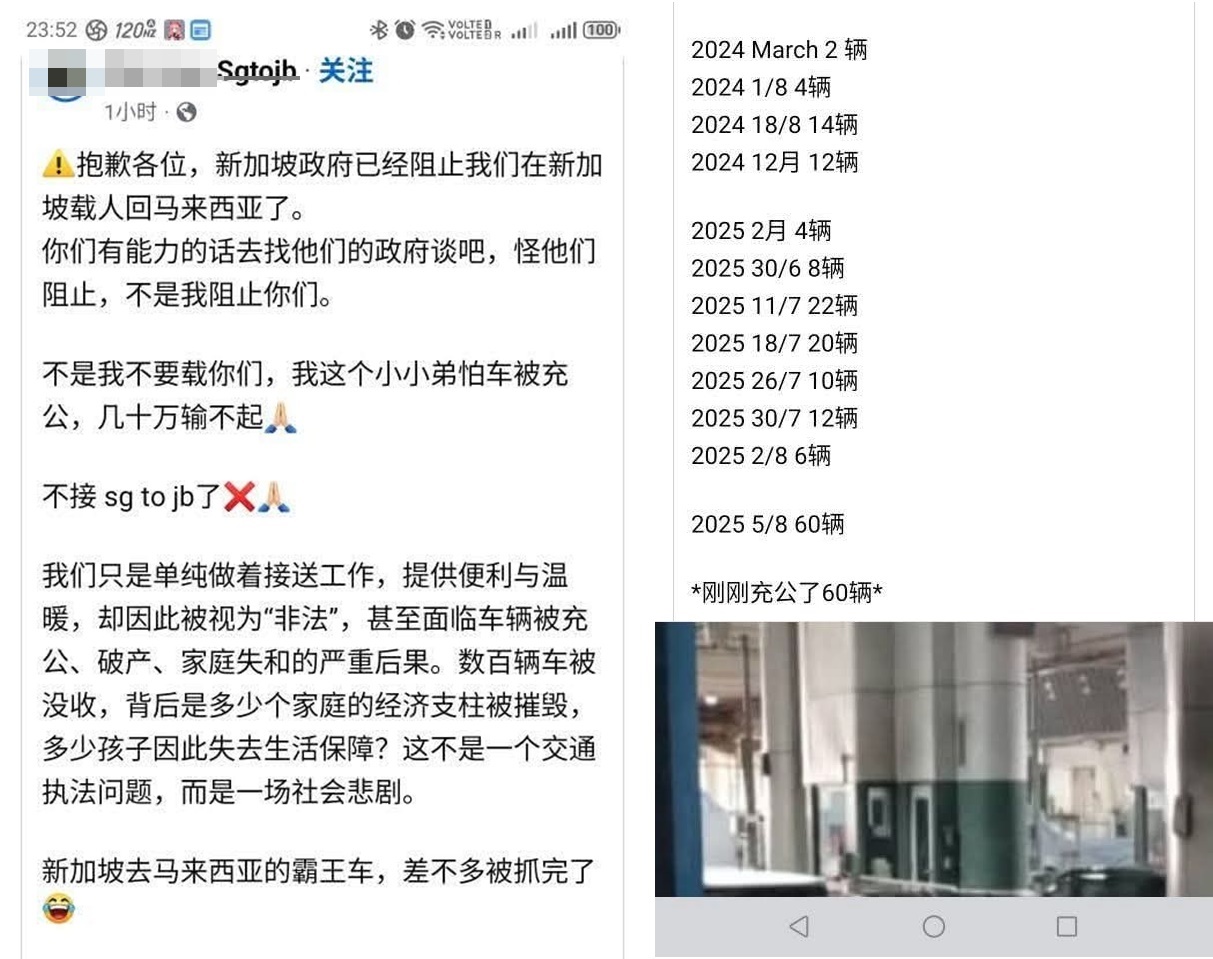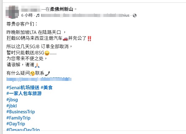 更有跨境包车业者陆续宣布,新加坡入境新山订单全部取消,只暂时接新山往新加坡的服务。主要是新加坡严禁跨境包车在新加坡载客,担心罚款和充公轿车。