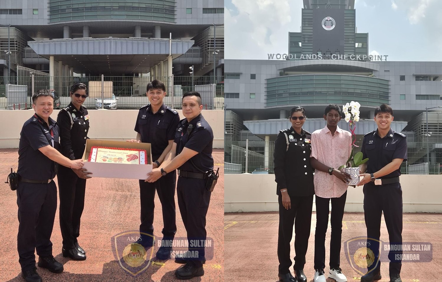 另外,苏丹依斯干达大厦(BSI,即柔佛长堤关卡)的助理指挥官(控制)Vimala,也代表大马边境管制及保护执法机构(AKPS)拜访新加坡兀兰关卡,特意赠送了蛋糕,庆祝新加坡60周年国庆。
