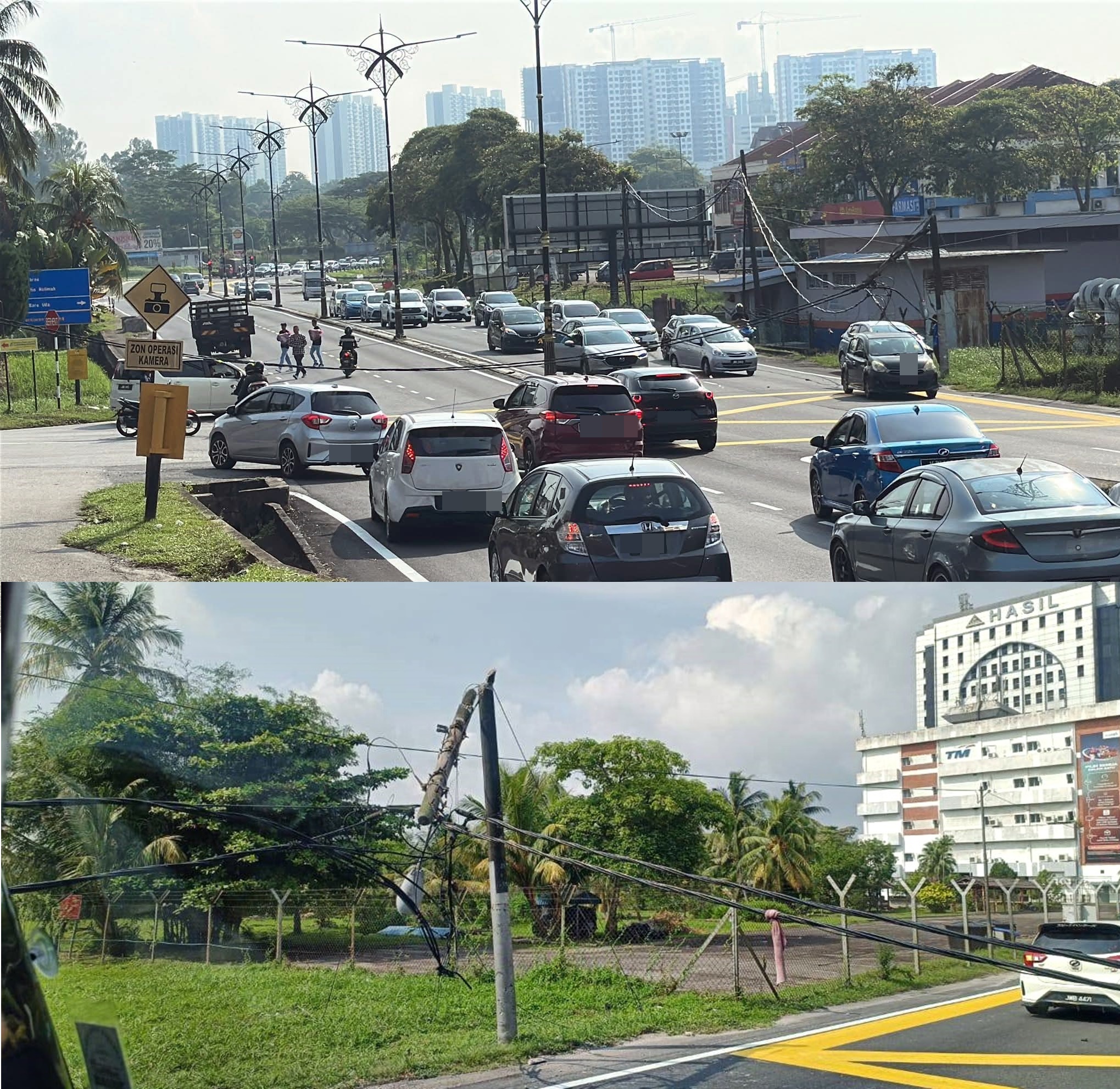 一辆Honda Jazz轿车失控撞上国能的灯柱,导致电灯柱断裂,电线掉落到路面上。