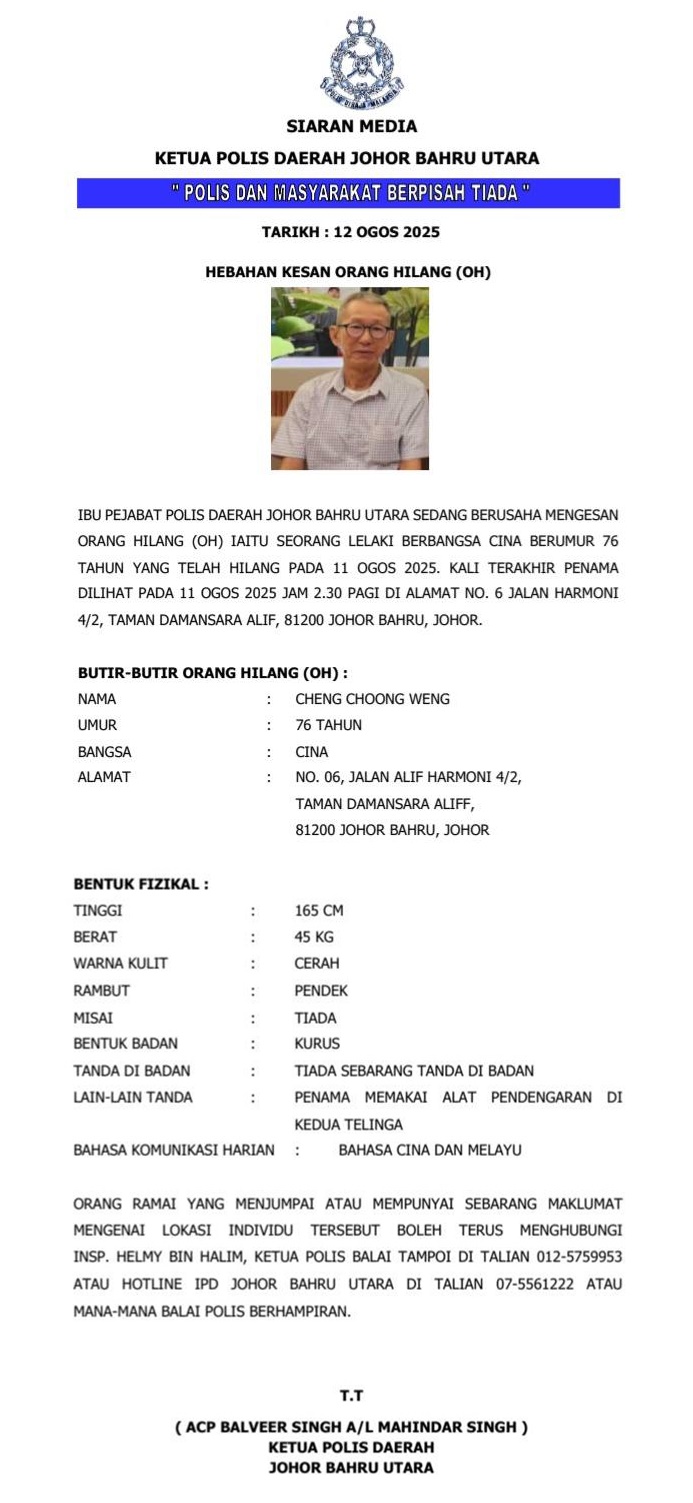失踪者是76岁的Cheng Choong Weng,昨日(11日)凌晨2时30分,从位于Damasara Aliff住家出门后,至今音讯全无。