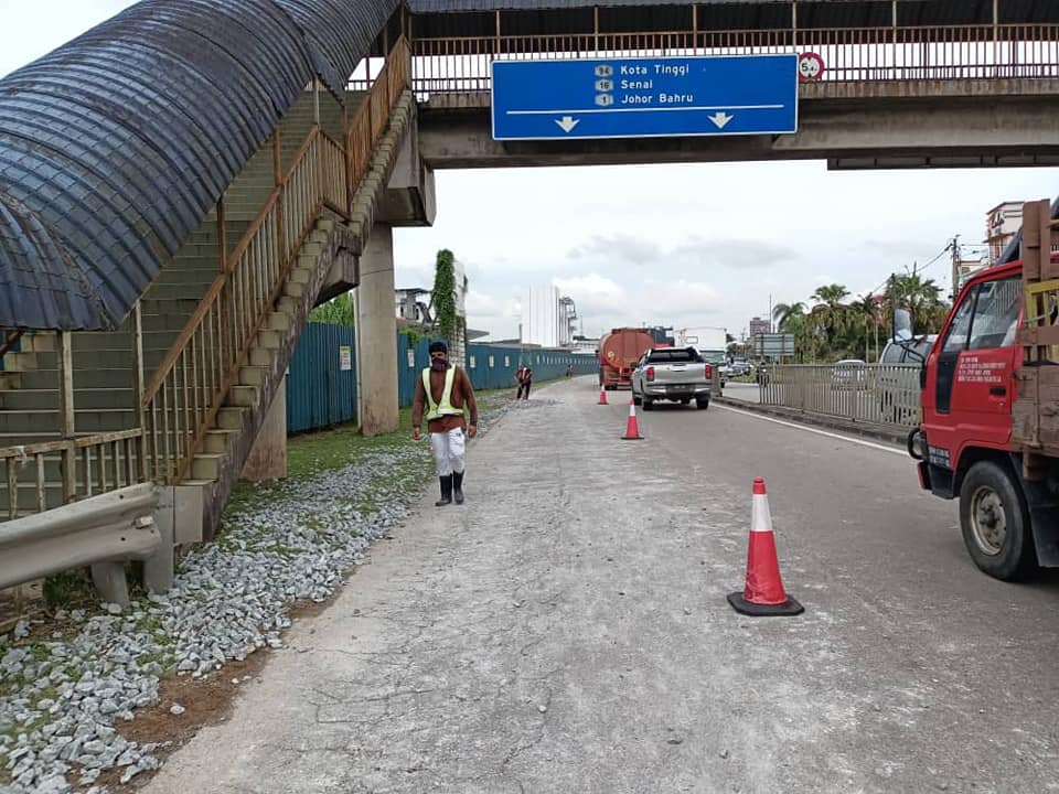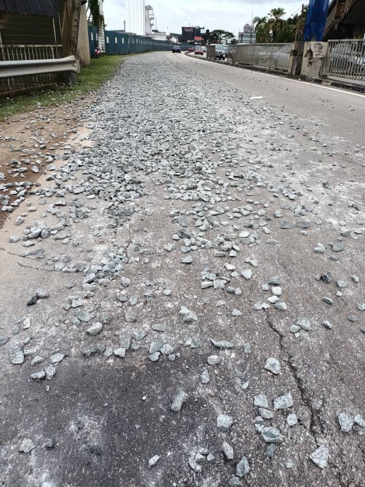 昨日下午3时许,在古来21哩(Mydin一带)的大路,一堆石头跌落满地。