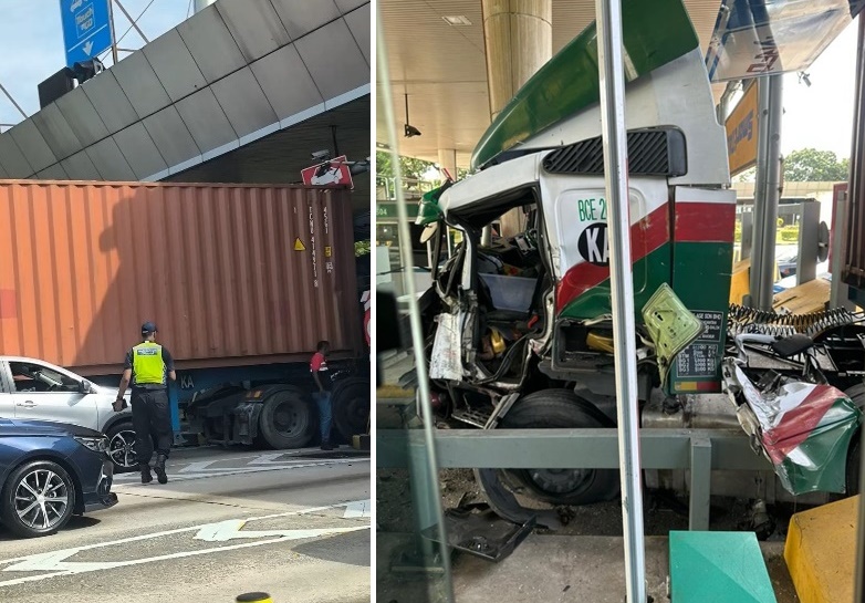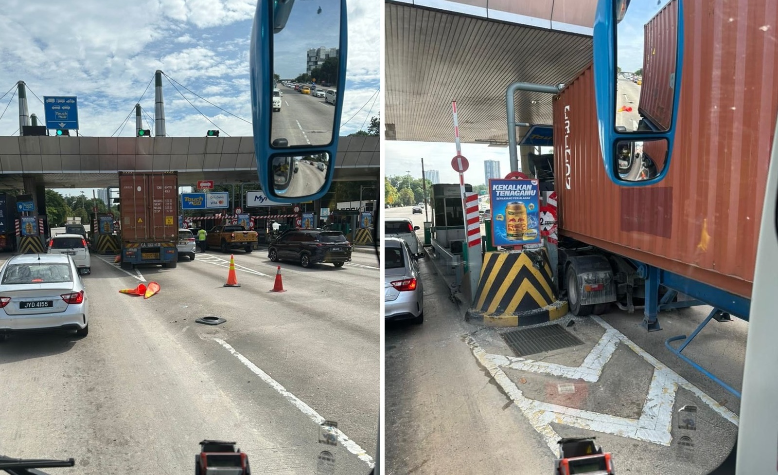 (新山14日讯)“巨无霸”因气动煞车器(brek angin)故障,直撞向柏伶收费站,女司机座驾也被波及,庆幸的是没有人受伤,却造成收费站大塞车。